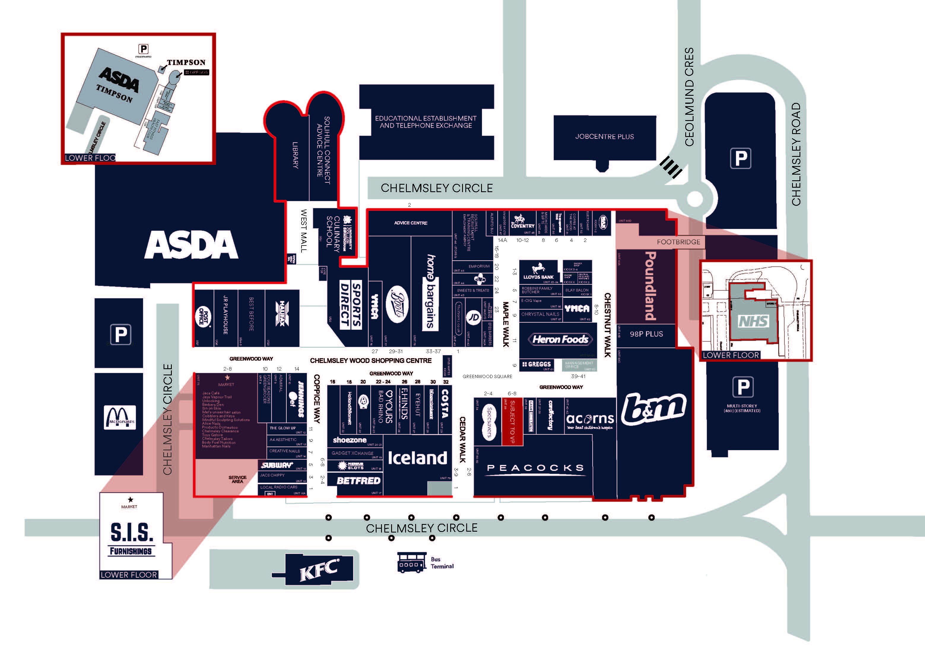 From M42 turn off at junction 7, continue straight ahead onto Coleshill Heath Road. Turn right onto Chelmsley Road. At the roundabout turn left onto Moorend Avenue, then right onto Chelmsley Circle and arrive at Chelmsley Wood Shopping Centre.